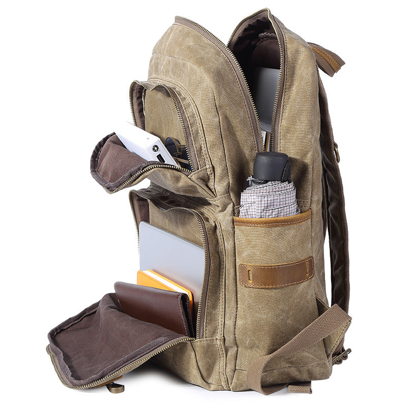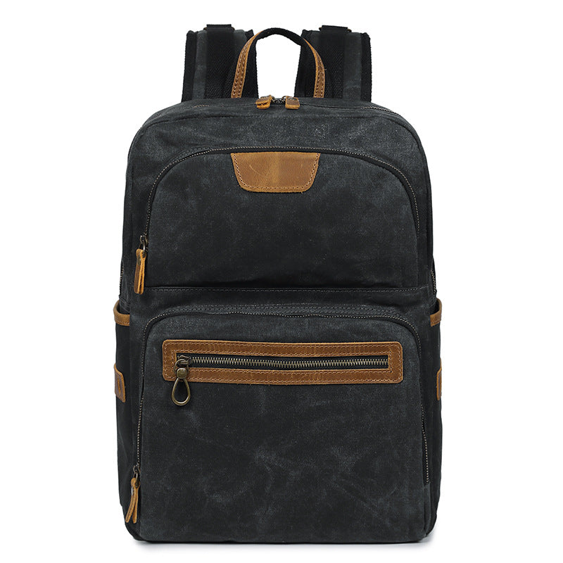Multi-purpose: Men's Canvas travel backpack has multi compsrtments and pockets: one large compartment, and five outside pockets ( two side pockets which you can put umbrella and cup in; there are also three front pockets, you can totally put your ipad and notebook in the biggest pocket, power bank in the midle pocket and keys in the smallest pocket). This bag can almost meet all your needs during travelling.