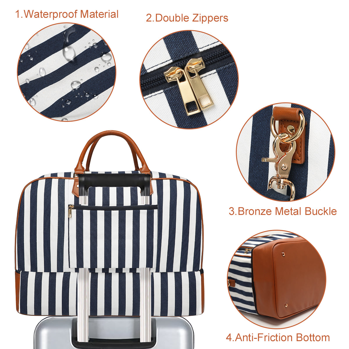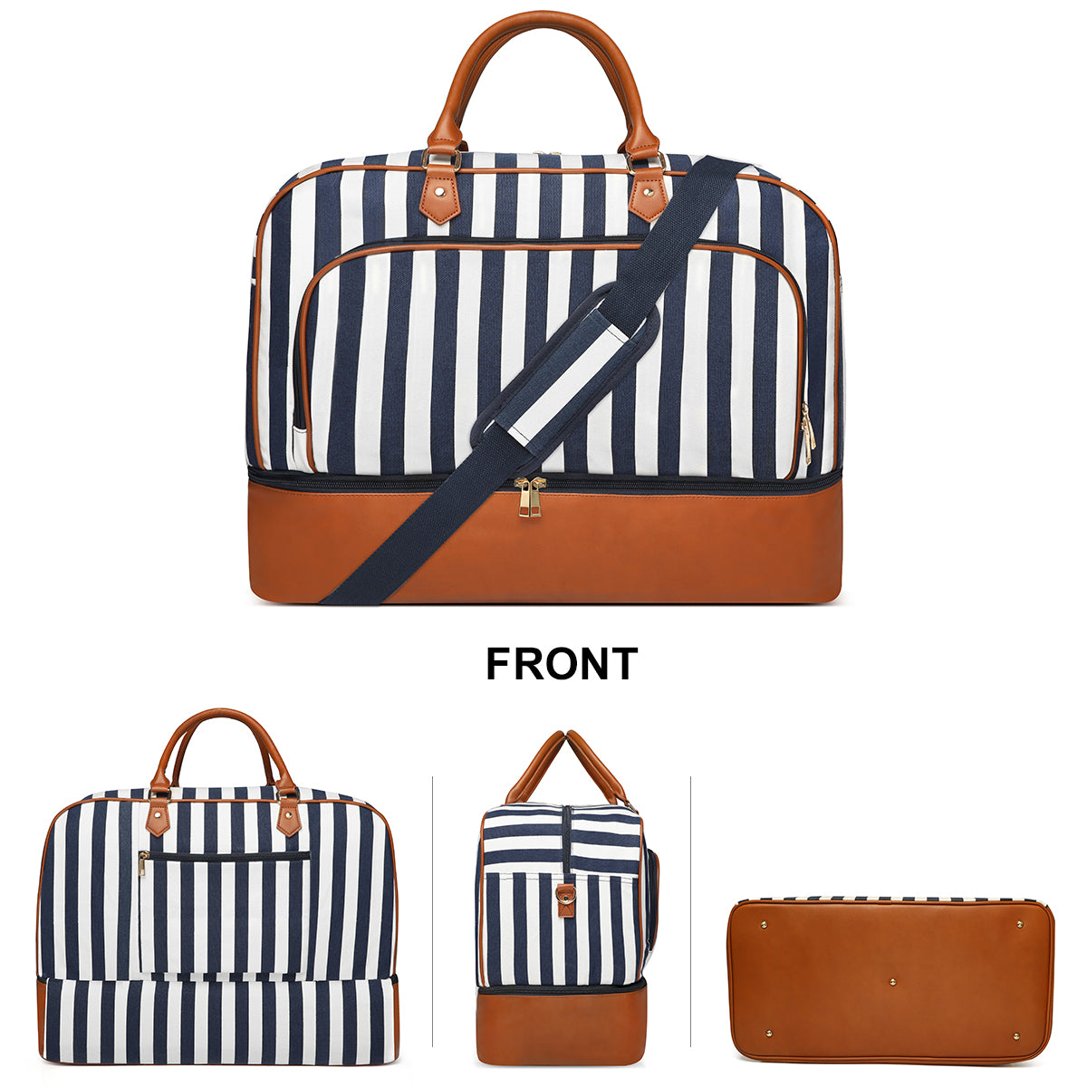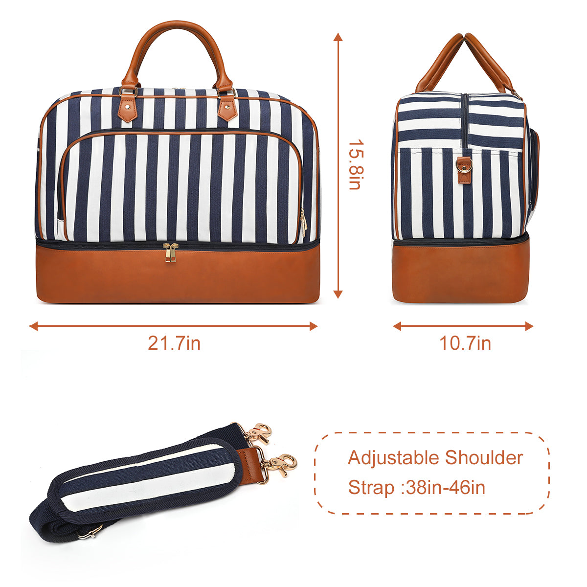Specifications: Canvas Hand Luggage Cross-body Travel Bag is made of finest-quality PU leather and sturdy canvas that is very durable and practical. And there is two colors for you to choose: blue and white stripes, black and white stripes, you can choose the one which can match most of your outdoor clothes.