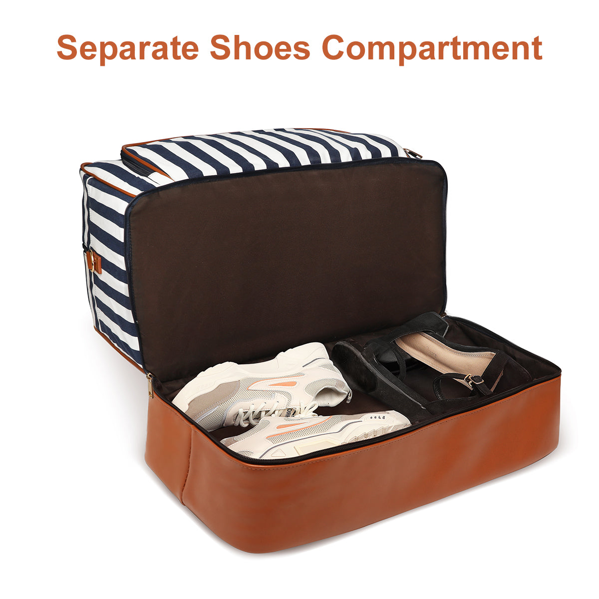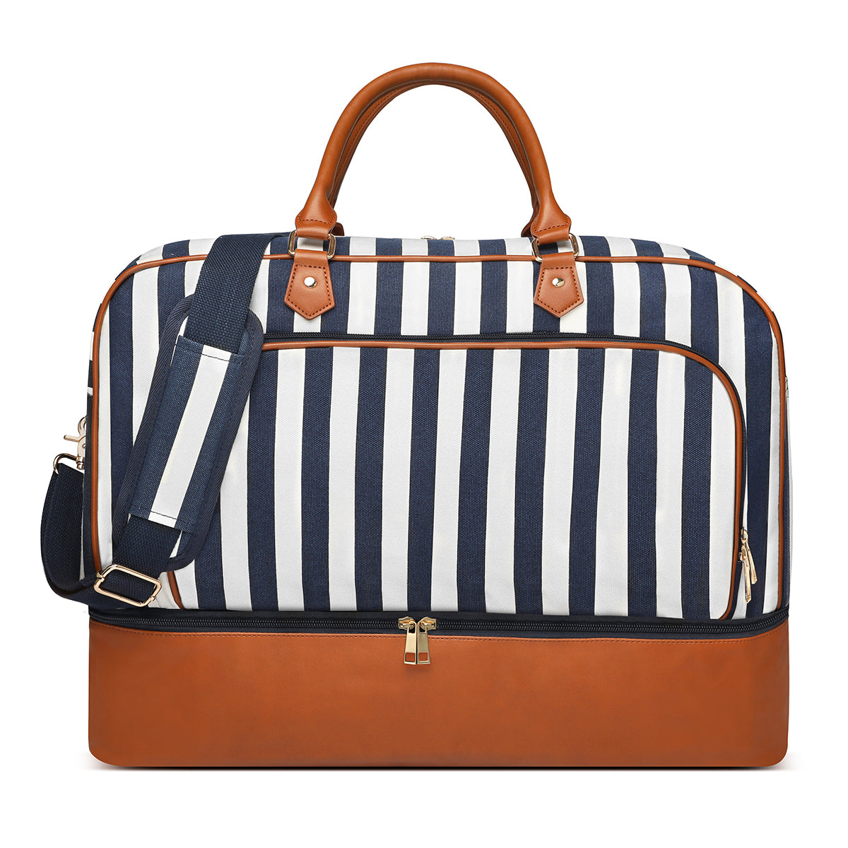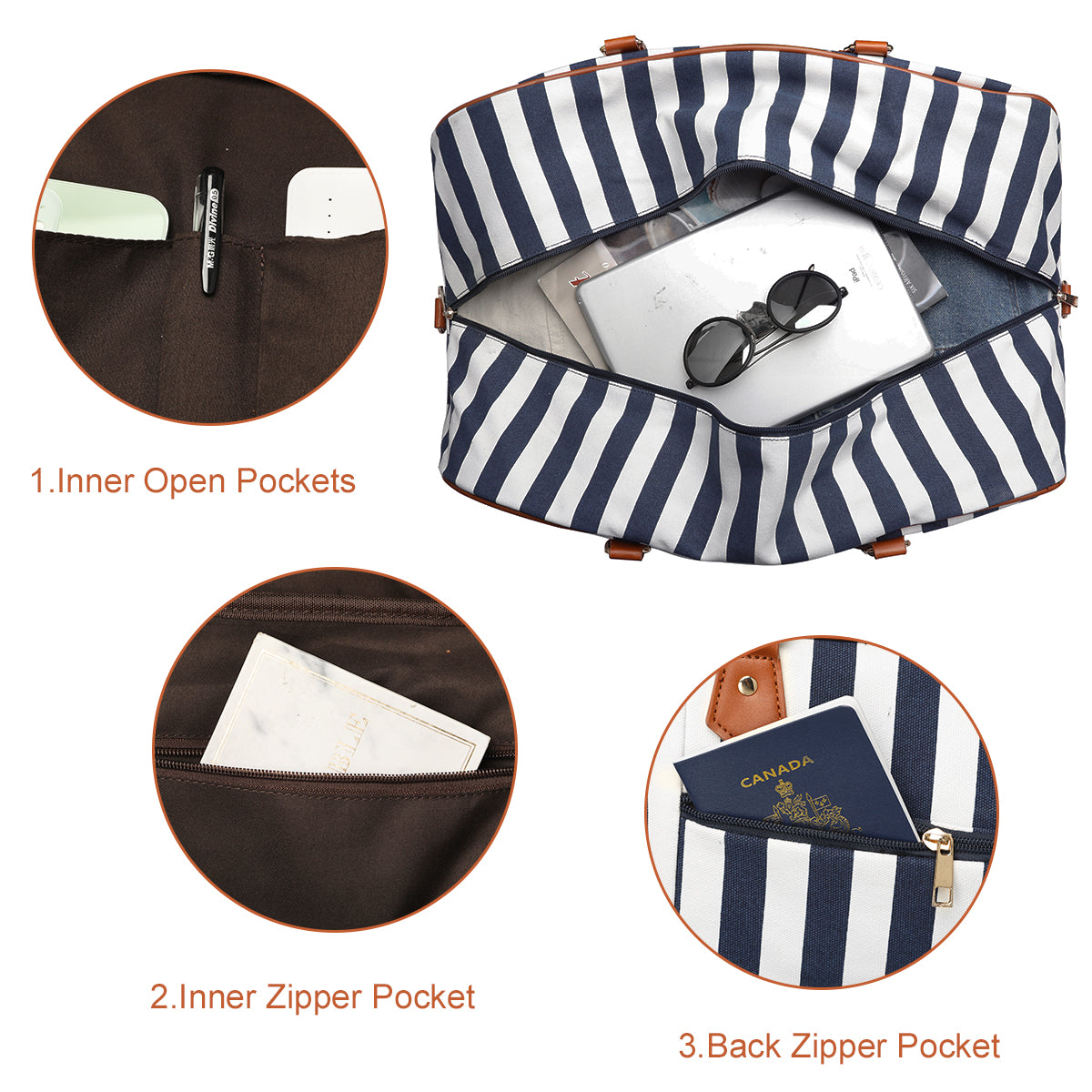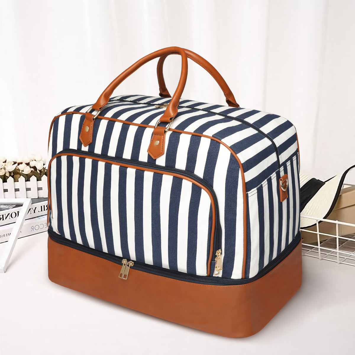 Specifications: Canvas Hand Luggage Cross-body Travel Bag is made of finest-quality PU leather and sturdy canvas that is very durable and practical. And there is two colors for you to choose: blue and white stripes, black and white stripes, you can choose the one which can match most of your outdoor clothes.